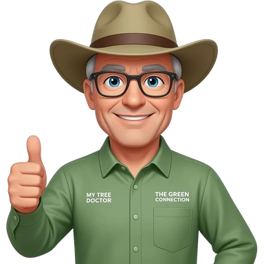 middle-aged, greyish haired man with blue, friendly eyes, dark-rimmed, rectangle glasses, in a green-collared, long-sleeve shirt with an wide-brim Akubra hat. Holding a thumbs up. On right pocket 'THE GREEN CONNECTION' in white. On left shirt pocket, written 'MY TREE DOCTOR' emoji