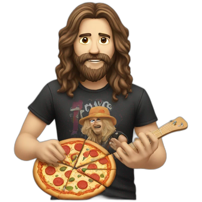 Long haired rocker with beard eating pizza emoji
