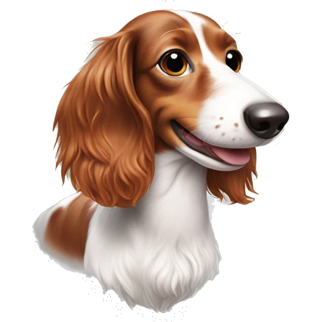 Long haired white and red piebald dachshund smiling with freckles whole body emoji | AI Emoji Generator