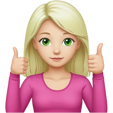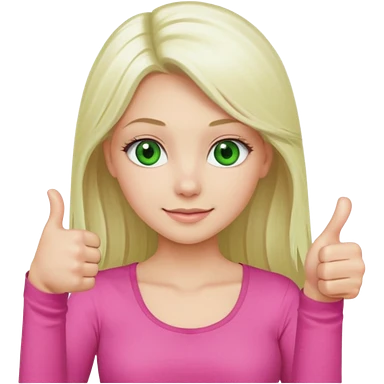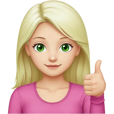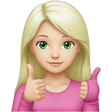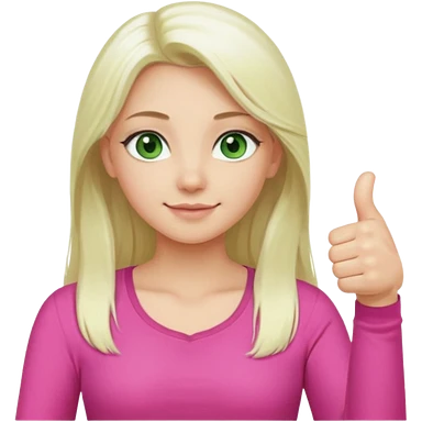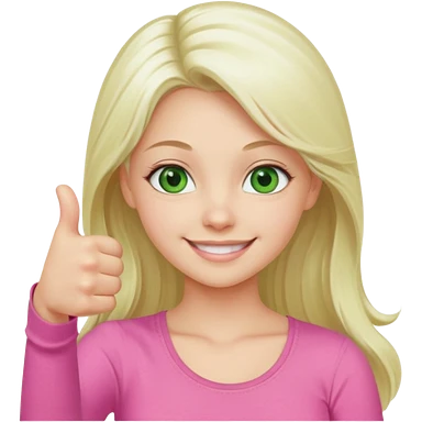 Long platinum blonde hair girl with green eyes in pink top showing a thumbs up emoji | AI Emoji Generator