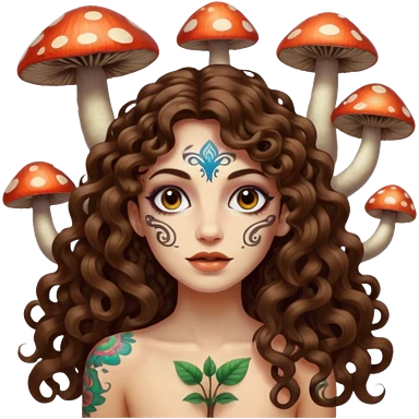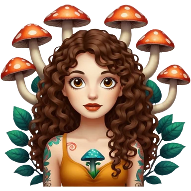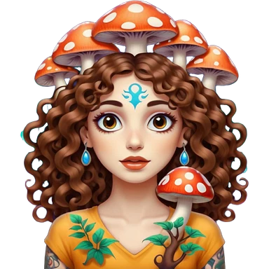 woman with long curly brown hair, brown eyes, white skin, tattoos, psychedelic mushrooms growing from her shadow emoji