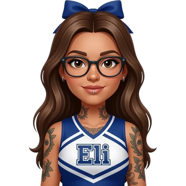tan girl with glasses, eyebrow piercing and septum, with tattoos on her throat and arms, and long hair, wearing a cheerleader outfit that says “Eli” emoji