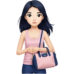 Girl with long black hair wearing soft pink tank top and sling navy blue longchamp bag emoji