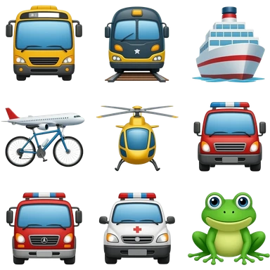 Look it all the vehicles: car, bus, train, ship, airplane, bicycle, helicopter, truck, fire engine, ambulance, and frog emoji