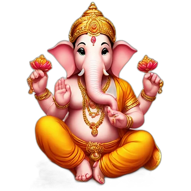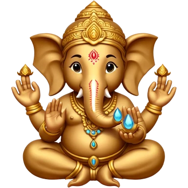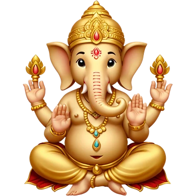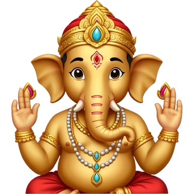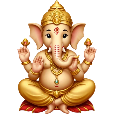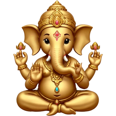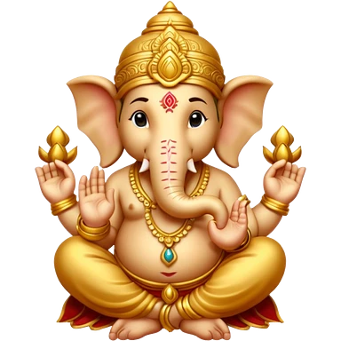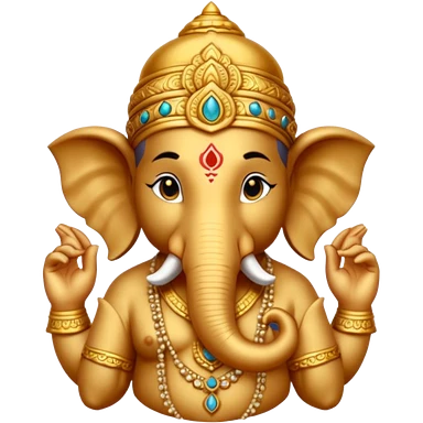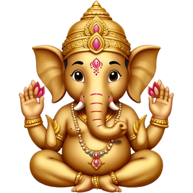 A cute and detailed emoji-style Lord Ganesha idol, with an elephant head, big ears, wearing a crown and ornaments, sitting on a lotus, holding a modak, vibrant colors, divine aura emoji