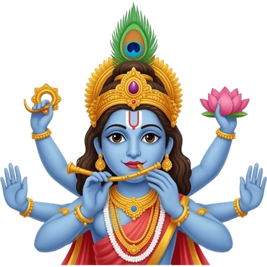4 handed Lord Krishna is wearing mayur pankh , holding sudarshan chakra in right hand, left hand lotus and another two hand flute on mouth. emoji