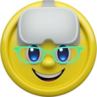 Crea un emoji amarillo tipo botón, sonriente, con casco y lentes VR, el casco sea blanco. Los ojos con luces neon y simplemente sonriendo. emoji