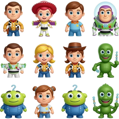 Buzz Lightyear, woody, Barbie, Ken, Jessie, bullseye, Mr tortilla head, Rex, aliens, Lotso, and hamm emoji