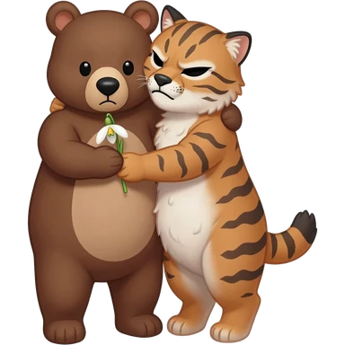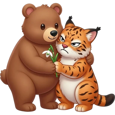 lovely bear hugs angry lynx and gives her a snowdrop flower with love emoji