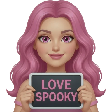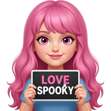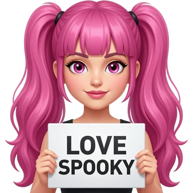 sexy girl with long pink hair and pink eyes wearing a holding a LOVE SPOOKY sign emoji
