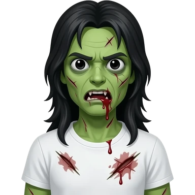 low quality, green skin zombie, all black eyes, black long curly 3c type hair, mouth slightly open with blood leaking out of mouth, wounds and cuts on zombie, white regular tee shirt, a young teenager, no wrinkles on face at all, eyes blacked out all the way with one eye shut, a ton of blood emoji | AI Emoji Generator