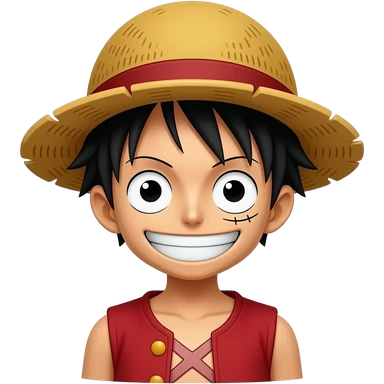 Monkey D LUFFY, Young guy with black hair in a red tank top, wearing a round straw hat with a red ribbon is making an extremely goofy silly face with a huge smile emoji