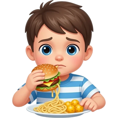 sad little boy eating a hamburger with spaghetti and cheese balls emoji
