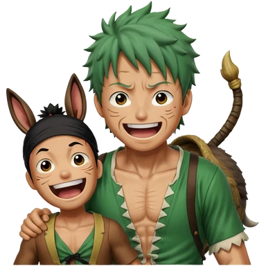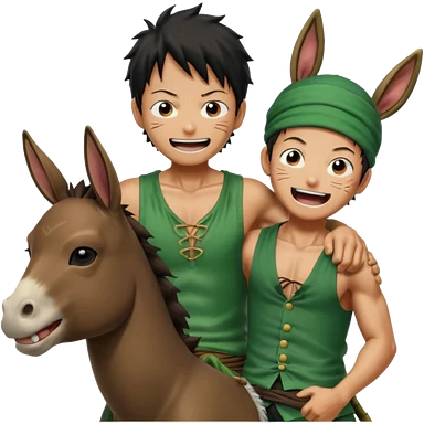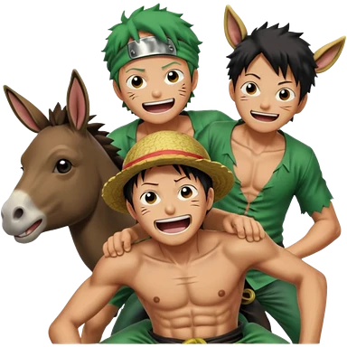 Luffy is riding on Zoro's back, and Zoro looks hilariously like the donkey. Zoro looks angry, and Luffy is laughing. The whole scene is very funny. emoji