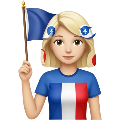 White woman with blonde hair holding a French flag in hand with a fleur-de-lily t-shirt emoji