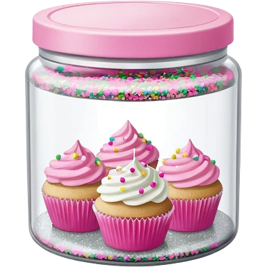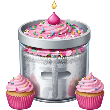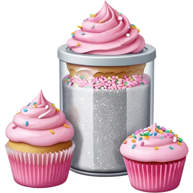 silver glitter in a small clear circular container with white lid next to a can of sprinkles and pink cupcakes emoji