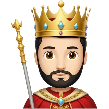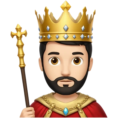 Bearded King, young king with short black beard, royal staff in hand, wearing crown emoji