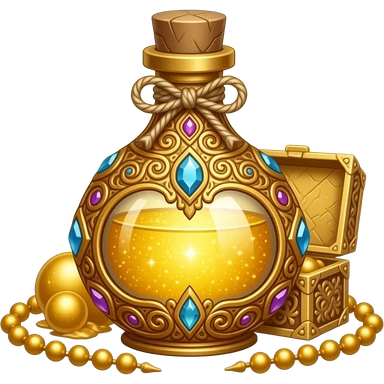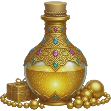 ornate golden potion bottle with intricate filigree, gemstones embedded, filled with shimmering luminous gold liquid, decorative cap tied with twine, surrounded by golden beads and an ornate box, glittering gold background, magical luxury aesthetic emoji