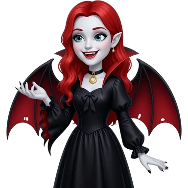 Vampiro femmina adolescente con la pelle bianca e i capelli rossi che indossa un vestito lungo nero e le maniche a zampa d' elefante e guarda la luna ed è felice emoji
