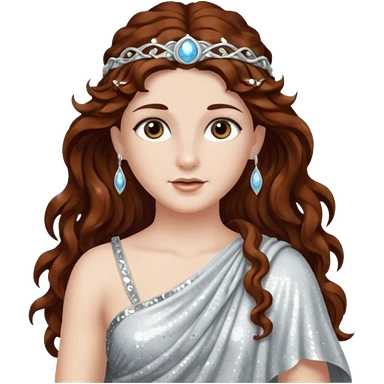 Diana, Goddess of Moon from Roman Deities with long dark auburn wavy hair, silver sequin toga emoji