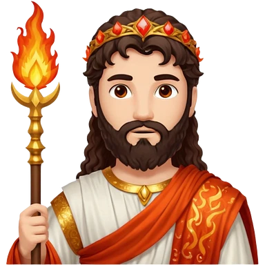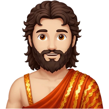 Vulcan, God of Fire from Roman Deities with long dark brown wavy hair and beard, red orange sequin toga emoji