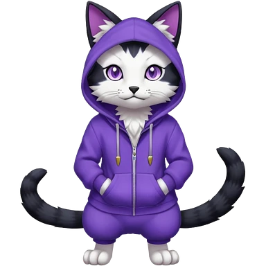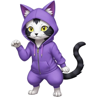 Black cat-garurumon-Gatomon-purloin-feline-Fakemon-Digimon-creature wearing a violet hoodie fursona (full body) emoji