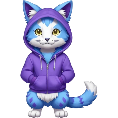 Blue garurumon-purloin-feline-Fakemon-Digimon-creature wearing a violet hoodie fursona (full body) emoji