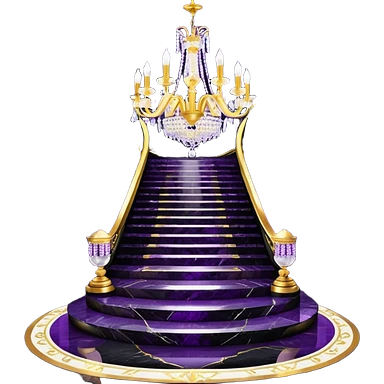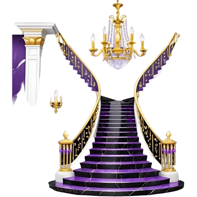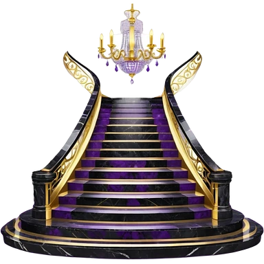 Luxurious black marble hallway stairs with gold and white accents with purple crystals in chandelier emoji