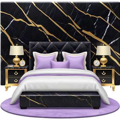 Luxurious black marble bed room with gold and white accents with a lilac-colored pillow emoji