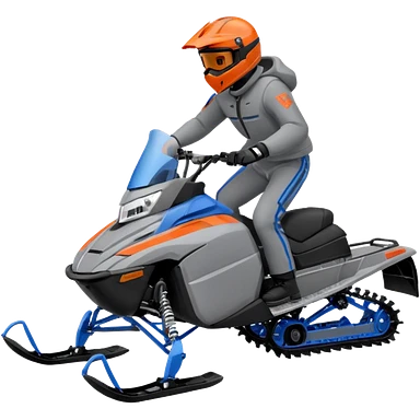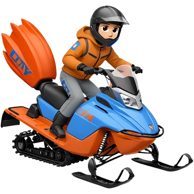 red Lynx brand snowmoble wheelies. driver with gray clothes and black/orange / blue helmet emoji