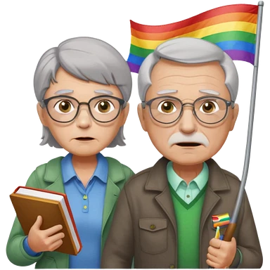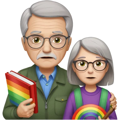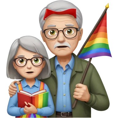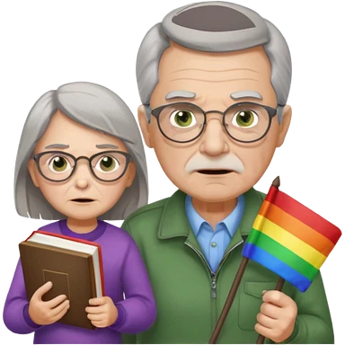 make old old man like 80 with gray hair and fur has HUGE EYE brows and glasses and is always mad and gay holding the rainbow flag and walking a young girl about 1 with brown hair and green eyes with a moth book with the other hand emoji