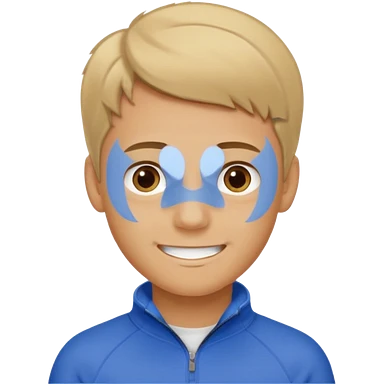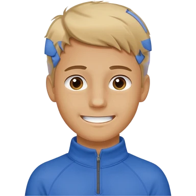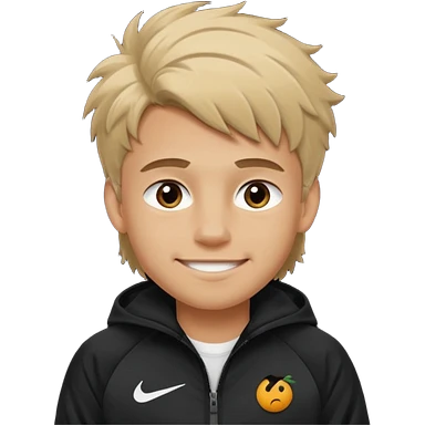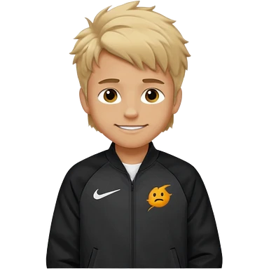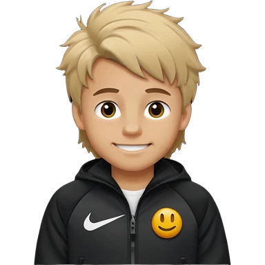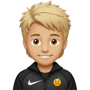 make a boy with fluffy dirty blond hair hazel eyes tan white smirky smile and nike tech emoji