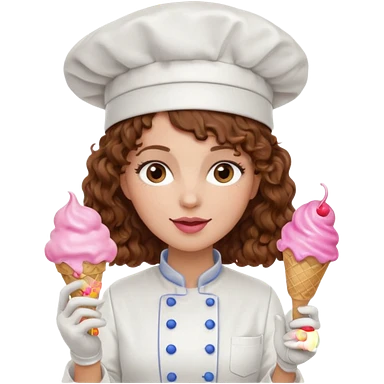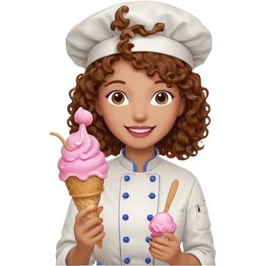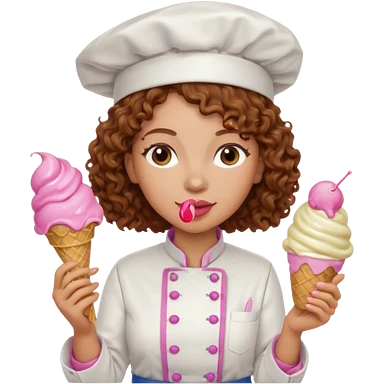 woman brown curly hair, chef, eating pink ice cream emoji