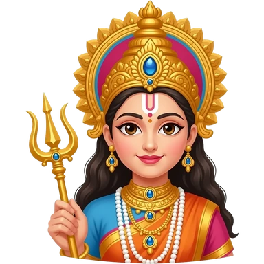 maa durga, long black hair, sitting on lion, holding trident, big bindi emoji