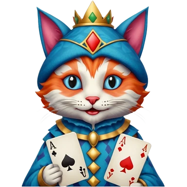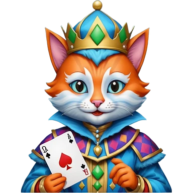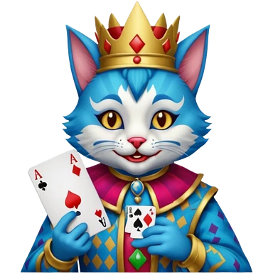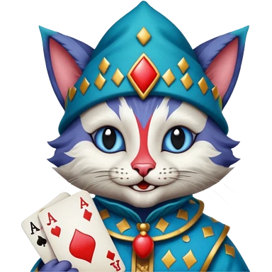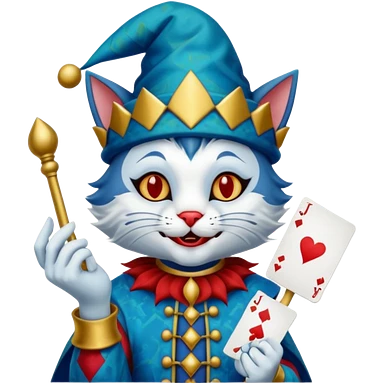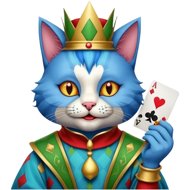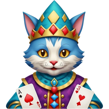 crazy colorful cute little cat jolly joker from poker, medieval, vintage, court jester, mac os icon, blue color, holds a single poker card emoji