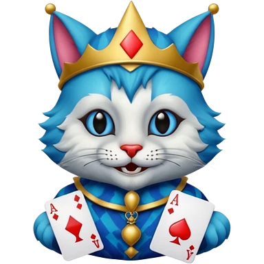 crazy colorful cute little cat jolly joker from poker, medieval, vintage, court jester, mac os icon, blue color, holds a poker card emoji