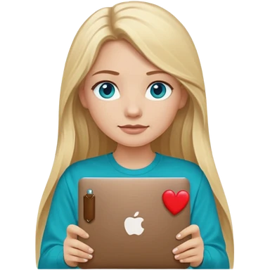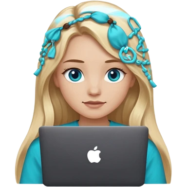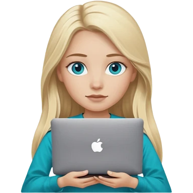blonde long hair girl using macbook emoji. she has blue eyes and dark coffee shirt with Teal coloured accesory emoji