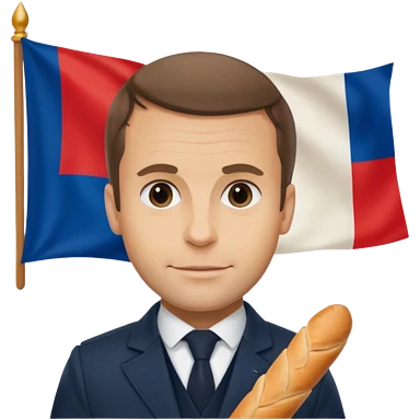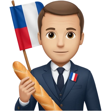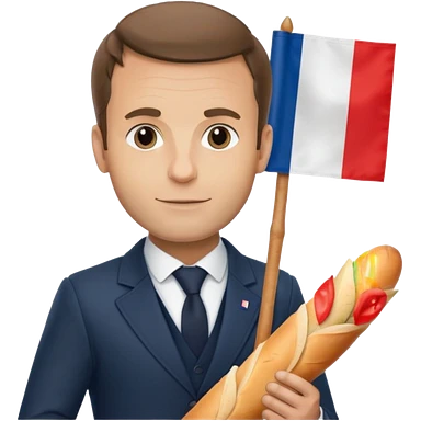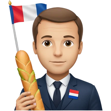 Macron avec une baguette et un drapeau français derrière lui emoji