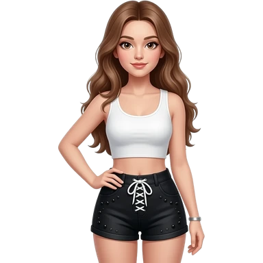une fille cheveux chatin claire peau blanche yeux marron avec un haut blanche crot top est un bas noire avec des choussure blanche avec des petit reyure noirequi fais une pose belle emoji