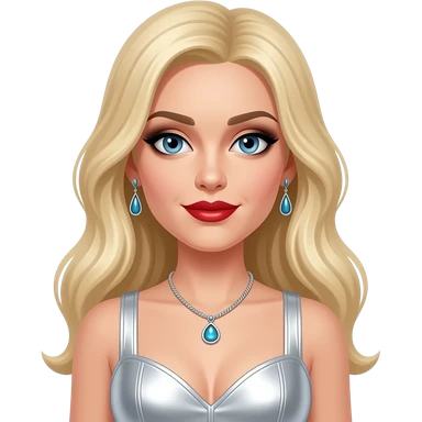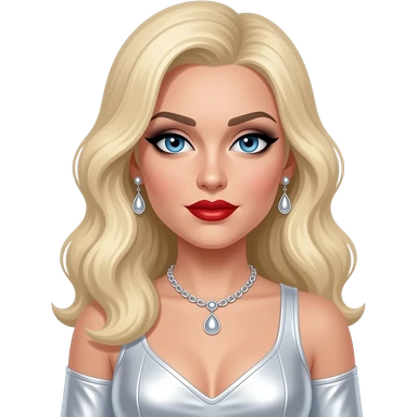 Madonna with blue eyes, long blonde 40s hair, black eyeshadow, red lipstick, white metallic pop outfit, necklace and earrings emoji