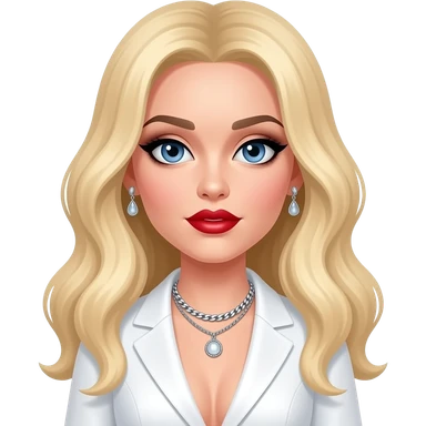 Madonna with blue eyes, long blonde 40s hair, black eyeshadow, red lipstick, white metallic pop outfit, necklace and earrings emoji