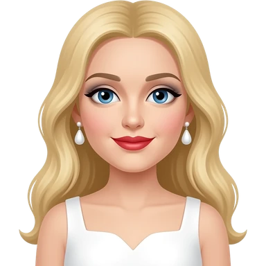 Madonna with blue eyes, long blonde hair, grey eyeshadow, red lipstick, white dress, white earrings emoji