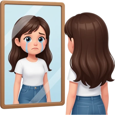 una chica triste viendose en un espejo ,su propio reflejo se cubre el cuerpo y hay en poster que muestra a una chica feliz con un buen cuerpo emoji