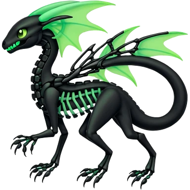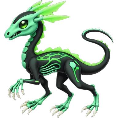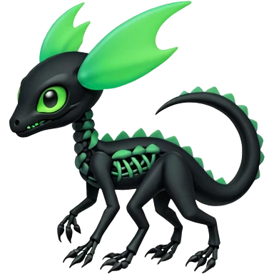 Obsidian-black and neon-glowing-green skeletal Meloetta-Salandit-Gorebyss-Salazzle-Pokémon-Fakémon-creature-fusion-hybrid emoji