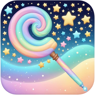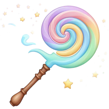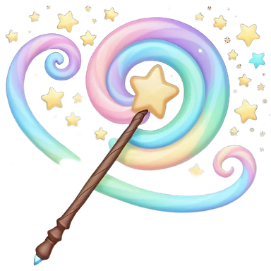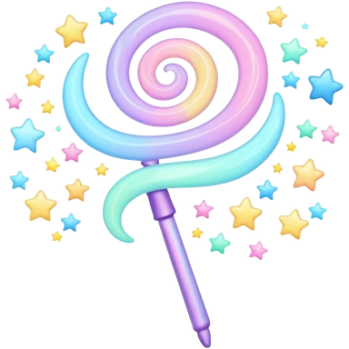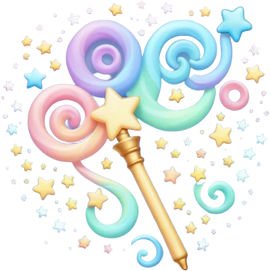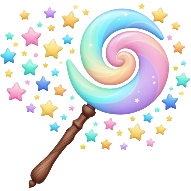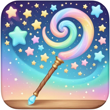 Cinematic cute magical wand, pastel swirls of color, tiny twinkling stars floating around, glowing softly, chubby rounded edges, whimsical and dreamy. emoji