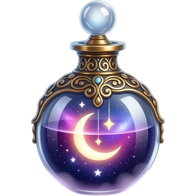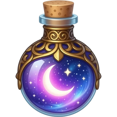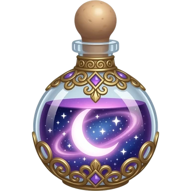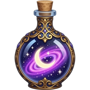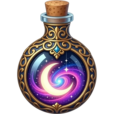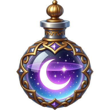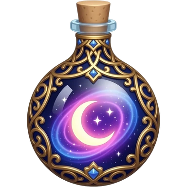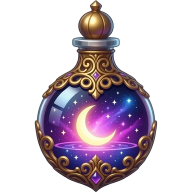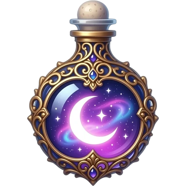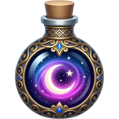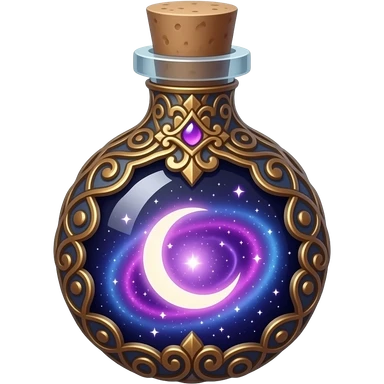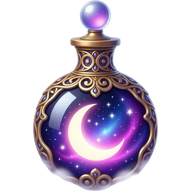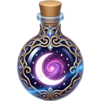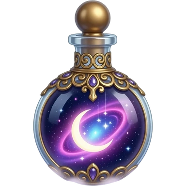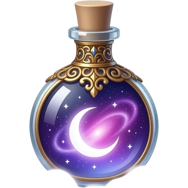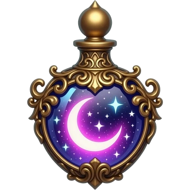 ornate glass vial with metallic filigree, swirling cosmic nebula inside, glowing purple‑pink‑blue light, crescent moon and tiny stars suspended in liquid, ethereal magical atmosphere emoji
