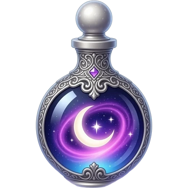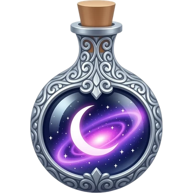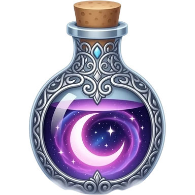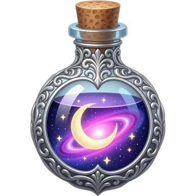 ornate glass vial with silver metallic filigree, swirling cosmic nebula inside, glowing purple‑pink‑blue light, crescent moon and tiny stars suspended in liquid, ethereal magical atmosphere emoji