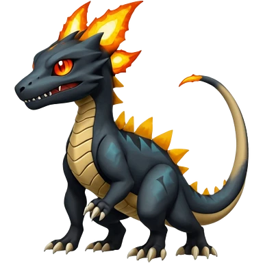Magmatic fiery badass cool obsidian-Black and golden-orange Helioptile-Marowak-Salamence-Fakémon-hybrid-creature (full body) emoji
