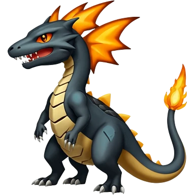 Magmatic fiery badass cool obsidian-Black and golden-orange Helioptile-Marowak-Charizard-Fakémon-hybrid-creature (full body) emoji
