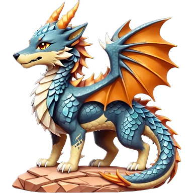 Majestic wolf-like dragon with red sandstone scales and layered plates resembling canyon rock formations. Crystallized mineral mane with copper and gold hues runs down its neck and back. Obsidian claws, amber eyes, and a tail of stone spires. Pokémon style. orange-ish brown fur/scales.emoji